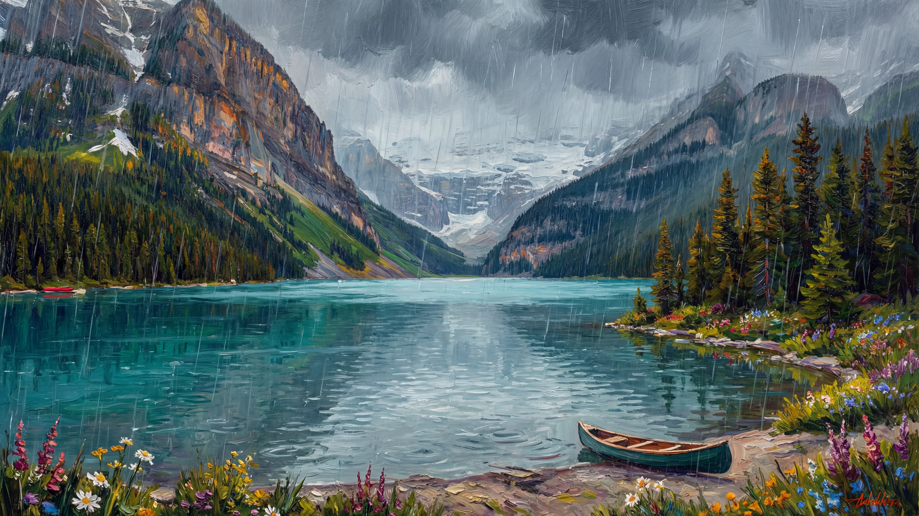 "Update the image and make it in a rainy day at Lake Luis in Banff National Park"
