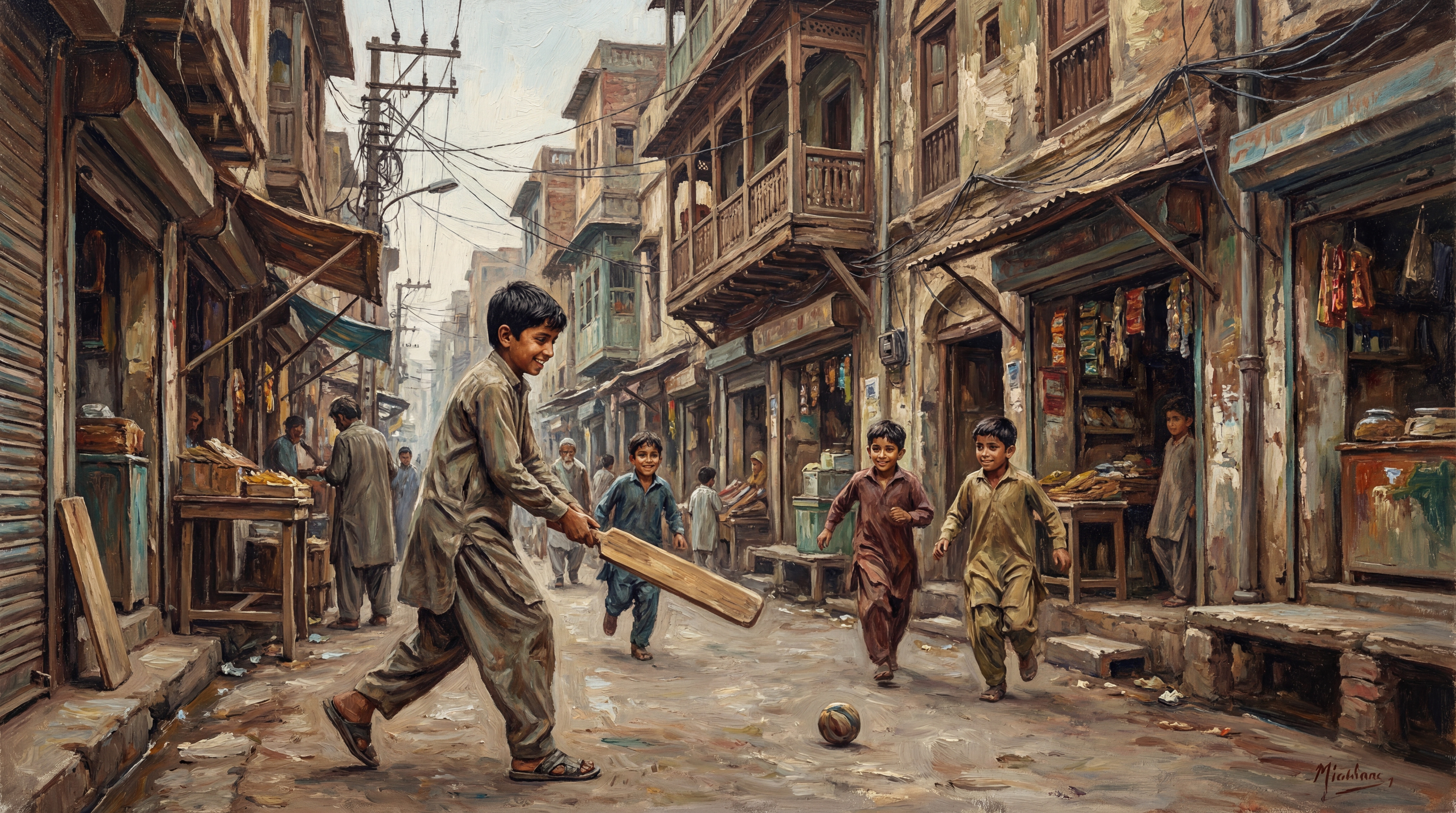 "A kid playing cricket in an old street in a city. Show an old city from an inner city"
