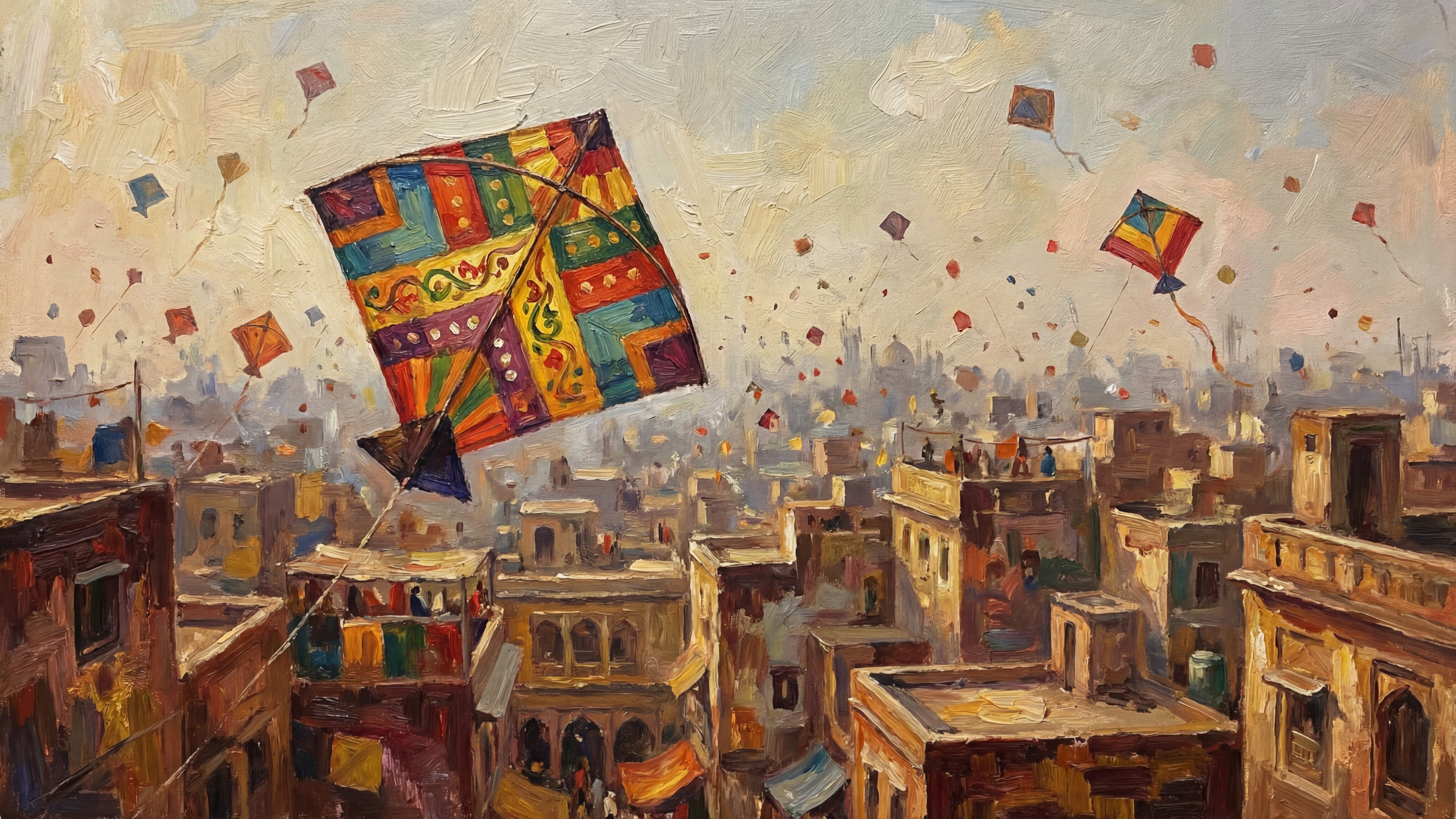 "A kid flying a kite in an old city. Add lots of kites for a kite festival"