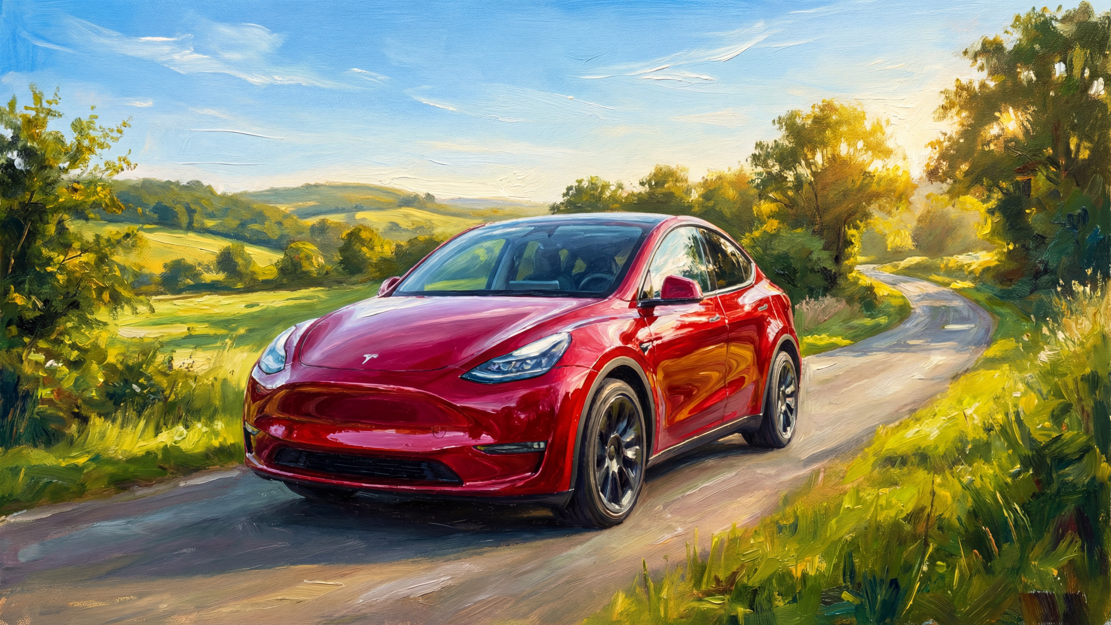 "A red Tesla Y in a beautiful nature scene with shining red under the sun"